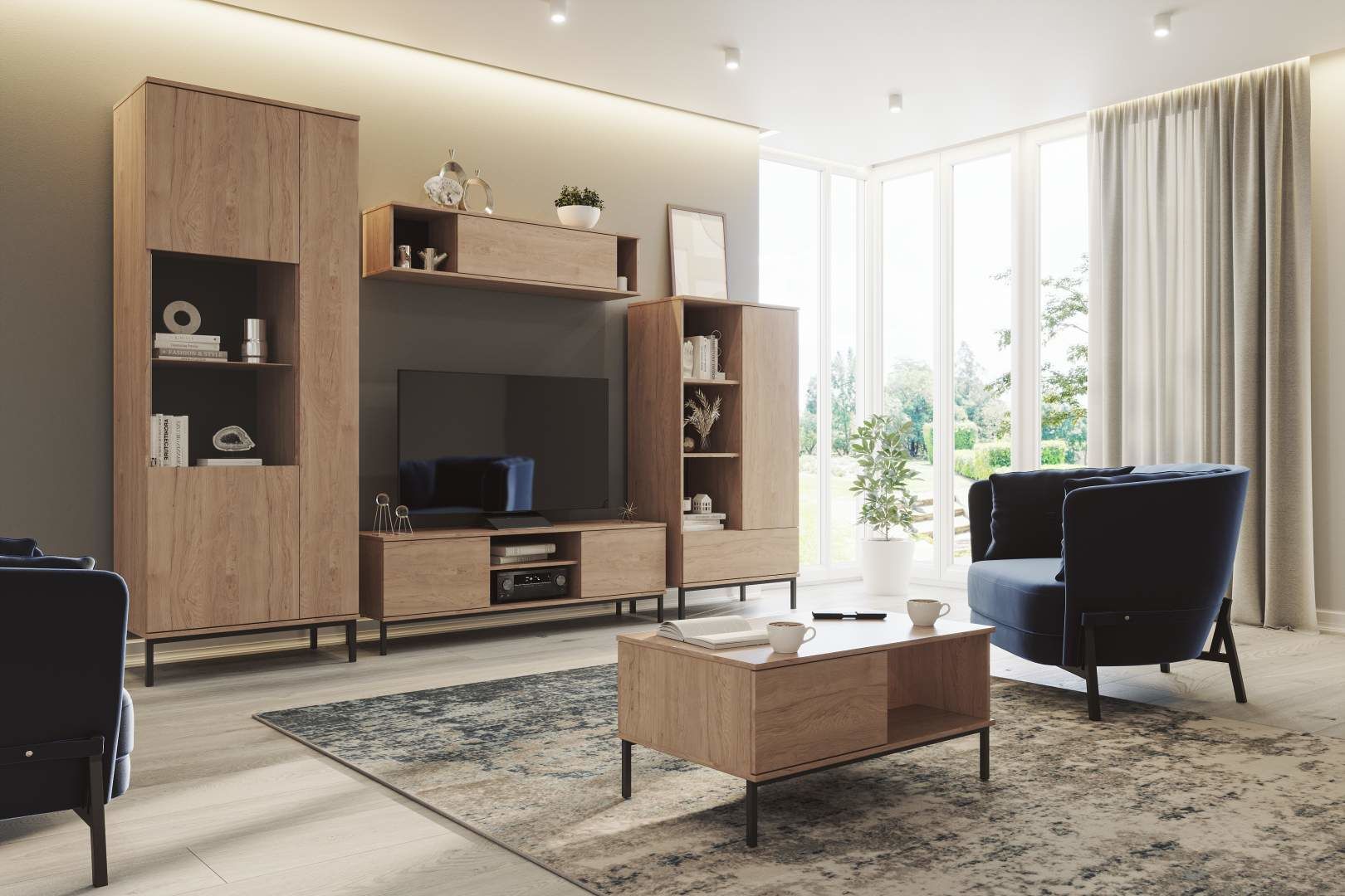 Vyzkoušejte originalitu s precizním řemeslným zpracováním v podobě moderní nábytkové sestavy. Tato sestava s komodou, vitrínou a nástěnnou policí je díky své prostornosti a množství úložného prostoru praktickým pomocníkem v každé domácnosti. Stylová nábytková sestava dodá vašemu interiéru zajímavý vzhled a zaslouženou pozornost. Díky praktickému úložnému prostoru budete mít vše přehledně uspořádané. Tato nábytková sestava je vyrobena z lamina, které věrně imituje reliéf dřeva a moderního lesku. Lamino je tloušťky 16 mm a poskytuje nábytku dostatečnou pevnost a stabilitu. Tento materiál je stálobarevný a odolný vůči mechanickému poškození, což zaručuje dlouhou životnost nábytku. Nábytková sestava je dostupná v oblíbeném barevném dekoru Bílá, Černá a Dub Hikora.