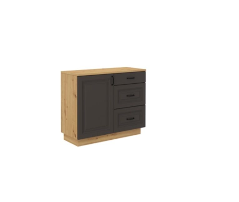 - je moderní prostorná komoda s dvířky a šuplíky vyrobena z lamina v dekoru dub Artisan a šedý mat. Komoda je vybavena policí. Úchytky jsou černé kovové.