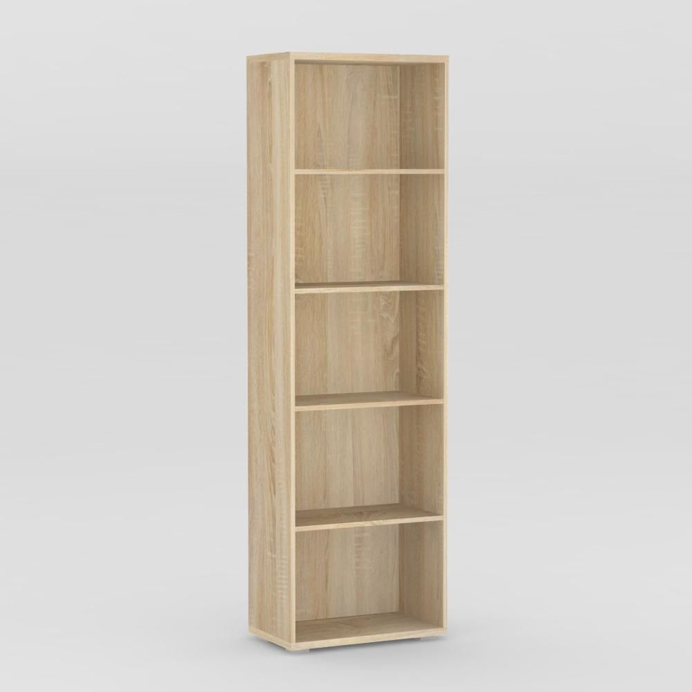 Regál s policemi a spoustou úložného prostoru je vyráběn z laminované dřevotřískové desky.