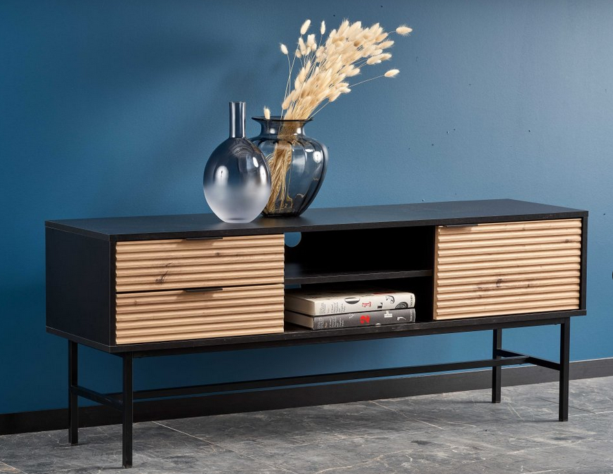 - je moderní televizní stolek vyrobený z lamina a MDF desek v barevné kombinaci dub artisan a černý mat. Možnost použití do obývacího pokoje nebo studentského pokoje.