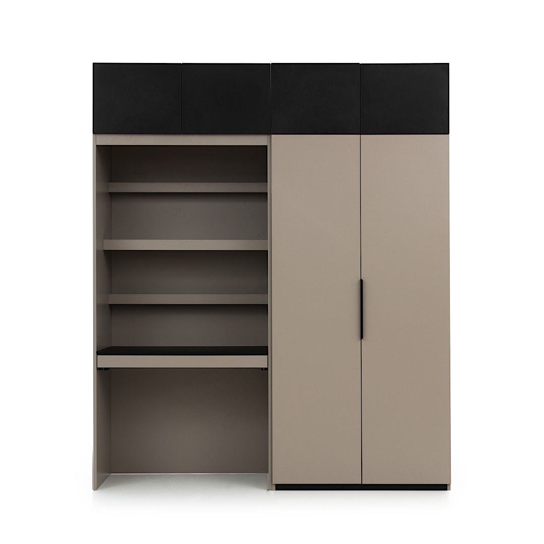 Sestava Uficio II. Vám poslouží jako odkladné místo i jako úložný prostor pro všechny předměty. Je to luxusní, originální a elegantní sestava s kvalitní povrchovou úpravou a krásnými liniemi. Zaujme především svými propracovanými a krásnými liniemi. Majitelé této sestavy jistě ocení atraktivní design do každého interiéru. Vyrábí se v barevném provedení černá mat / šedá , jež dodává tomuto nábytku moderní, atraktivní a nevšední design. Sestava prakticky kombinuje šatní skříň s držáky a policemi a regál se stolkem tak, aby bylo možné všechno oblečení uložit a mít dostatek prostoru i na svoje pracovní povinnosti. Sestavu je možné zakoupit samostatně nebo v doporučeném nábytkovém systému Uficio. Systém Uficio obsahuje další komponenty, které lze spolu libovolně kombinovat, jelikož jde o sektorový nábytek. Díky této vlastnosti si tak můžete sestavit nábytek v jakékoliv místnosti v bytě či domě podle sebe. Šatní skříň Uficio je určena do každého moderního interiéru.