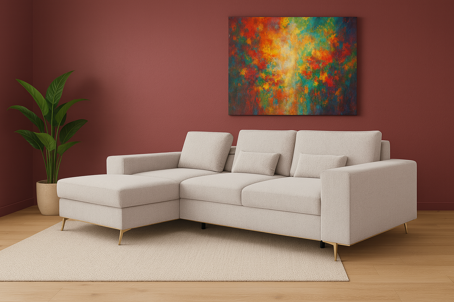 Rohová sedací souprava CHROMENEW mini - pohodlná kvalitní sedací souprava s úložným prostorem a možností za příplatek rozkladem na lůžko 136 x 230 cm. Sedací souprava má nádech luxusu díky chromové liště a vysokým nožkám ve stříbrné, nebo zlaté barvě, které se nachází ve spodní části.
