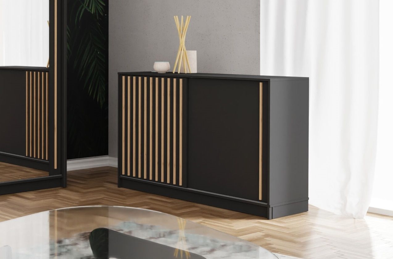 Komoda ROYAL - moderní kombinovaná komoda se šuplíky i dvířky vyrobená z kvalitního lamina v barevných dekorech černá / černá + lamely dub wotan, šedá / šedá + lamely dub wotan , bílá / bílá + šedé lamely, dub wotan / dub wotan + lamely dub wotan, bílá / bílá + lamely dub wotan.