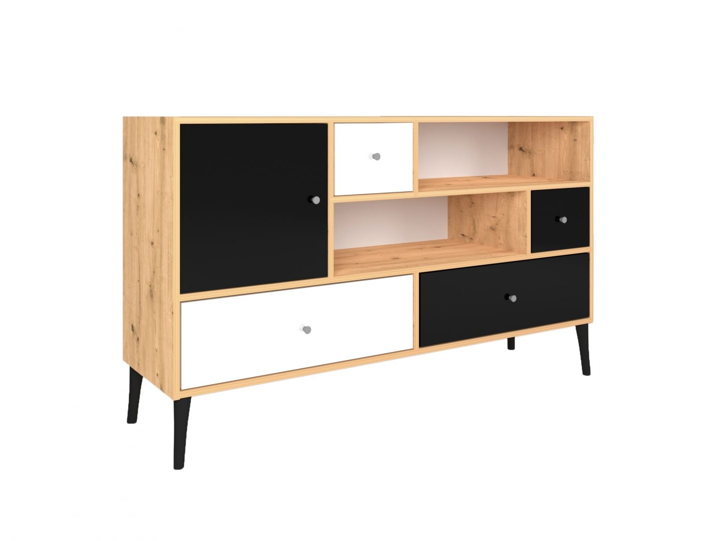 Komoda Karo 140 - moderní kombinovaná komoda se šuplíky i dvířky vyrobená z kvalitního lamina v dekoru dub grande / bílý lesk / černý lesk