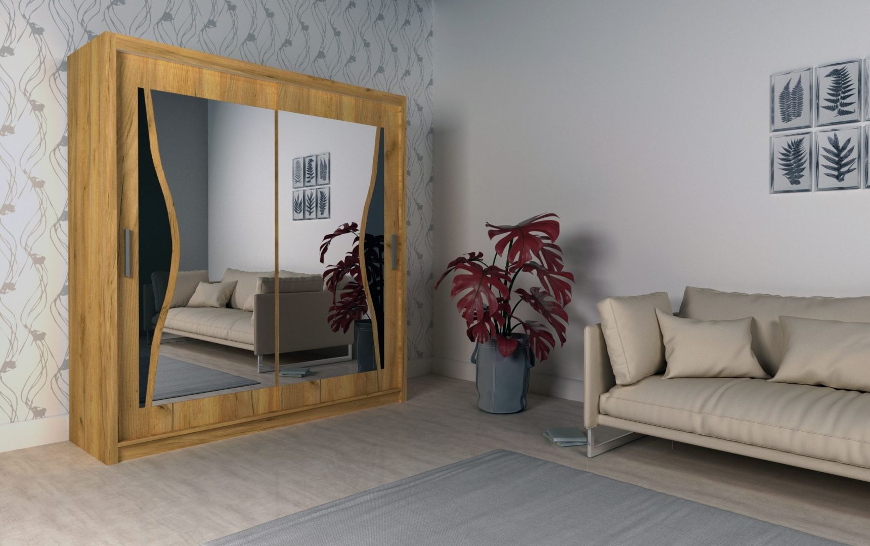 Šatní skříň BATUMMI má neotřelý design, kvalitní povrchovou úpravu a je vhodná jak do ložnice, dětského nebo studentského pokoje. Tento praktický kus nábytku se hodí díky svému modernímu designu do každého interiéru. Na výrobu této praktické šatní skříně byly použity LTD desky, které díky vysoké kvalitě zpracování snesou vysoké zatížení. Zároveň jsou nenáročné na údržbu a jsou tvarově stabilní. Skříň je vyrobena z kvalitního lamina tlouštky 16 mm s ABS hranou a je dostupná v oblíbených barevných dekorech. Posuvné dvěře jsou opatřeny kvalitním kováním sevroll. Vnitřní vybavení, police, šatní tyč a také LED osvětlení je v ceně.