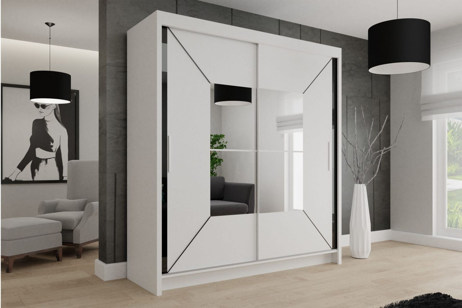 Šatní skříň NICOLE- je vyrobená z lamina a zrcadlem na posuvných dveřích s kováním sevroll a tichým dojezdem. Dostupná v několika barevných provedench.