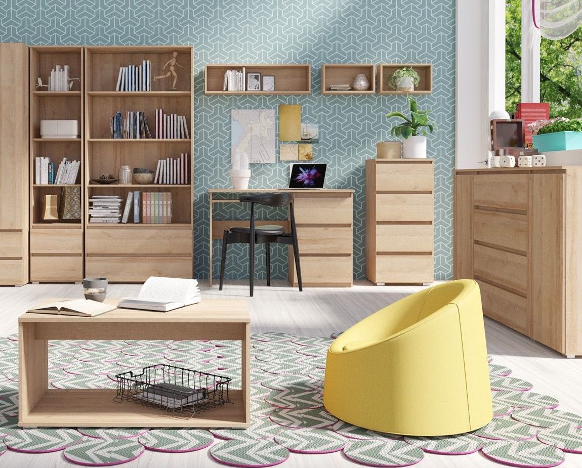 C01 regál, C03 policový regál s šuplíky, C09 psací stůl, 2x C11 polička, C12 polička, C07 komoda, C10 konferenční stolek, C06 komoda