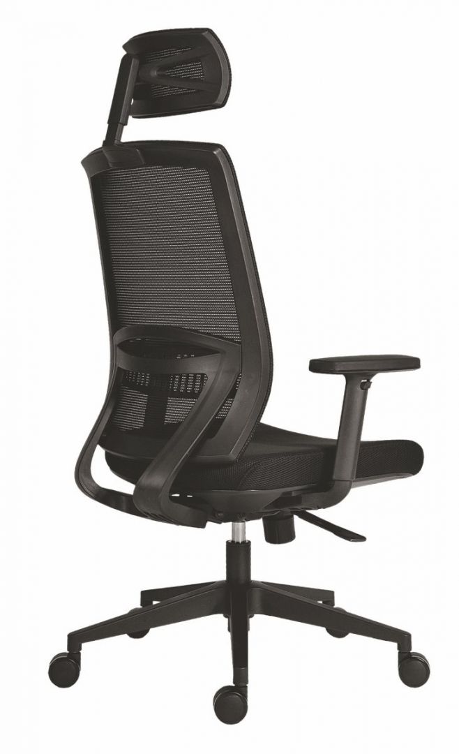 Moderně designovaná kancelářská židle se síťovinou na opěradle a podhlavníku PDH, synchronní mechanismus s několikanásobnou aretací a nastavením síly protiváhy, područky s měkkou dotykovou plochou, výškově nastavitelné, výškově nastavitelná bederní opěrka, flexibilní výškově nastavitelný podhlavník PDH, moderní plastová báze, kolečka Ø 60 mm s gumovou obručí pro všechny typy podlah.