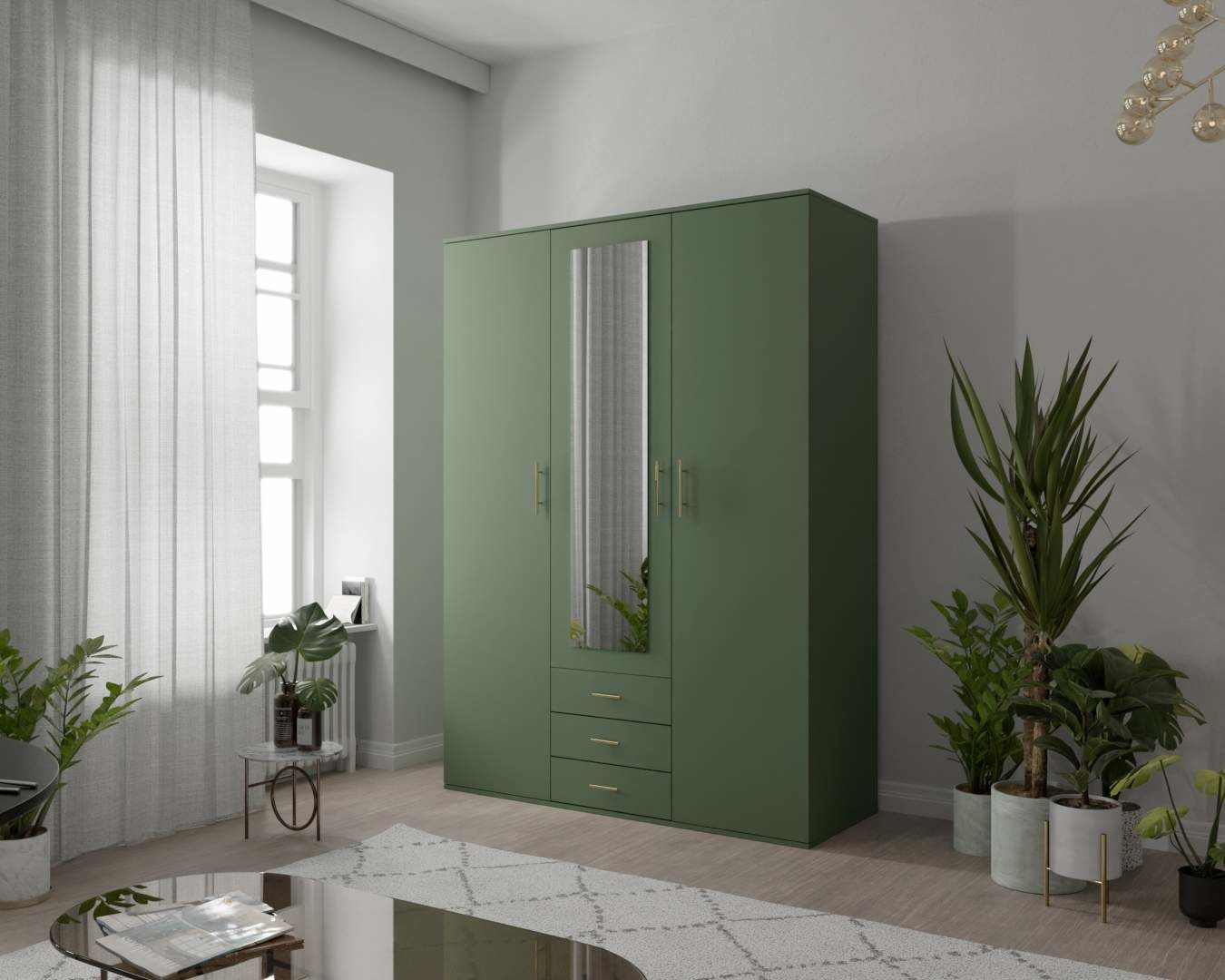 Šatní skříň OLAFF - je vyrobena z kvalitního lamina v moderní barvě tmavě zelené se zlatými úchyty.