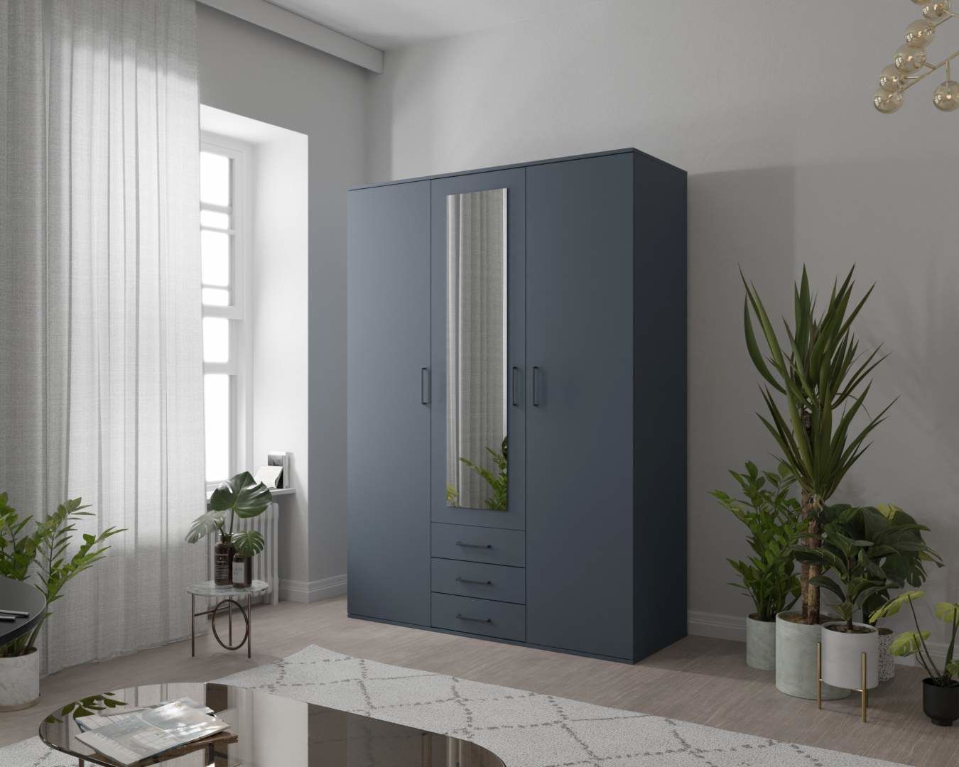 Šatní skříň OMEGO - je otevírací skříň vyrobena z kvalitního lamina v moderní tmavě modré barvě s modrými úchyty.