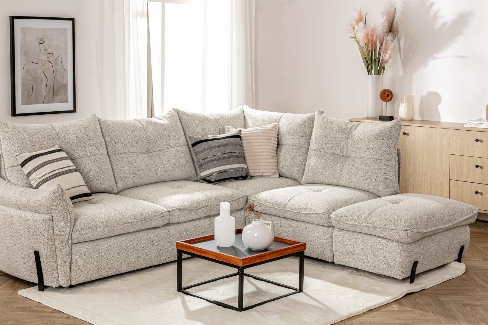 Rohová sedací souprava ALMEIRA je luxusní a kvalitní nábytek, který zaujme svým elegantním designem na stylových kovových nožkách. Má krásné provedení a je ideální na vytvoření spokojeného a elegantního interiéru. Majitelé těchto sedaček u nich ocení zejména jejich výbornou povrchovou úpravu a velké pohodlí, které poskytují při posezení, díky provedení sedáku a opěráku. Výplň sedáku tvoří kombinace vysoce kvalitní visco-elastické pěny s pružinami Faliste. Opěrné polštáře jsou opatřeny kvalitní silikonovou výplní, která zaručuje vysoký komfort sezení a tvarovou stálost a dlouhou životnost a s uchycením na zip. Konstrukce sedačky je z měkkého a tvrdého dřeva. Náleží k ní velký výběr potahových látek včetně omyvatelných. Sedací souprava s rozkladem na lůžko 144 x 219 cm a úložným prostorem. Vzorník potahových látek je momentálně k dispozici na prodejně.