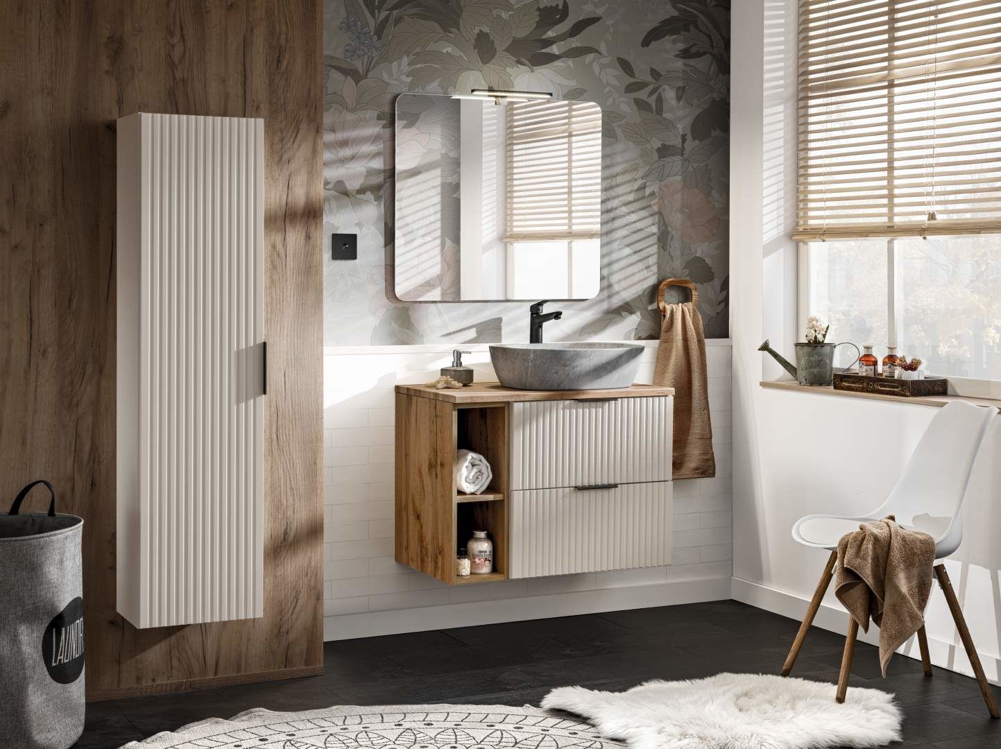 Ve skvělém moderním vzhledu se vyznačuje nejvyšší kvalitou zpracování materiál MDF v provedení Kašmír s drážkovanými čely. Skříňky mají tichý uzavírací systém s možností výběru úchytů ve 3 barvách - zlatý lesk, lesklý chrom a černý mat v balení jsou všechny barvy.