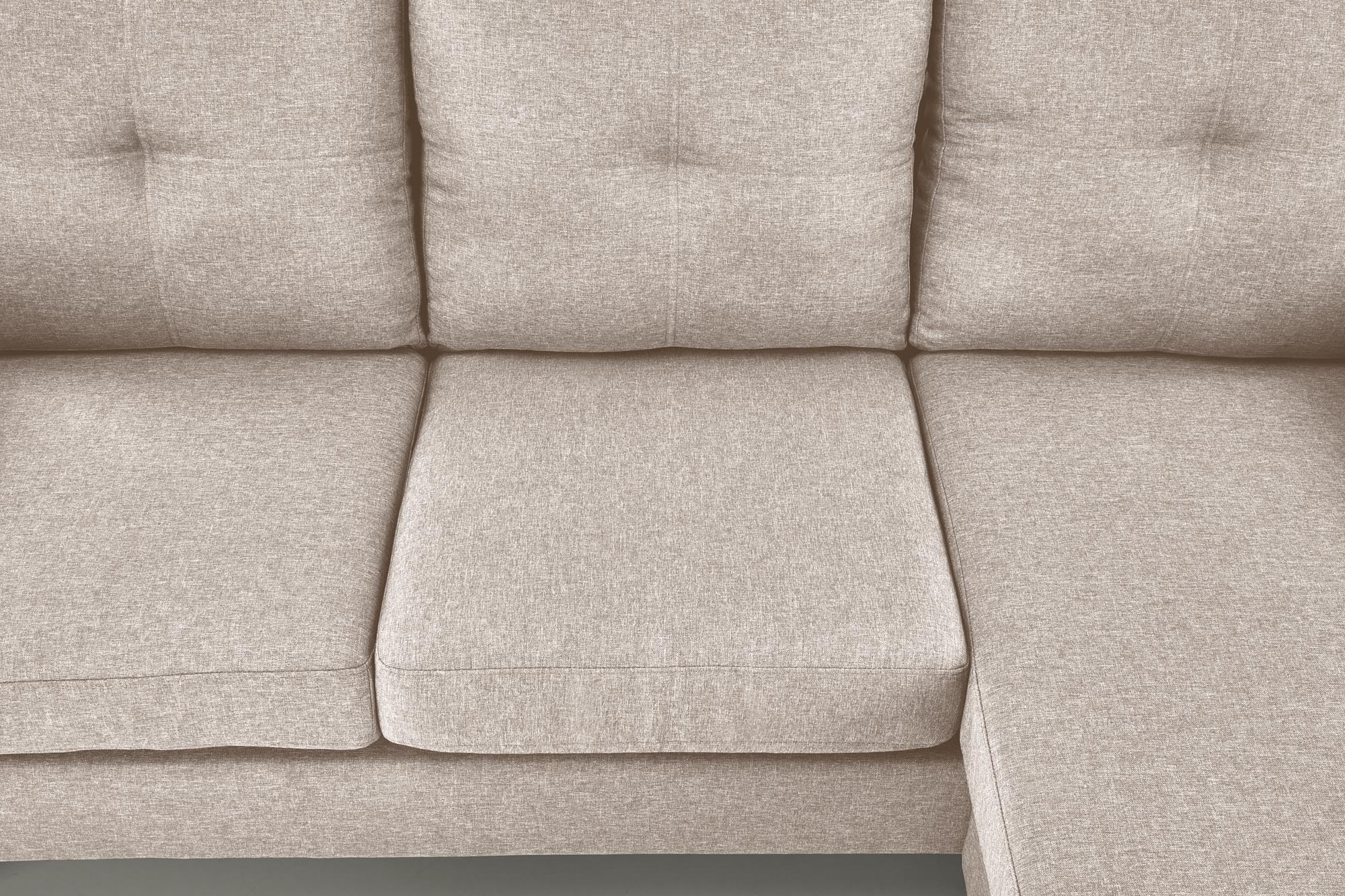 Moderní čalouněná pohovka s taburetem s kterým vytvoříte na pohled rohovou pohovku. Nohy sedačky jsou vyrobeny z polypropylenu v černé barvě s čalouněním v tkanině béžové barvy. Pohovka Vám nabídne prostor pro pohodlnou relaxaci a odpočinek po náročném dni a zároveň tvoří elegantní bytový doplněk. Je vhodné do obývacího pokoje, dětského pokoje nebo také pracovny.