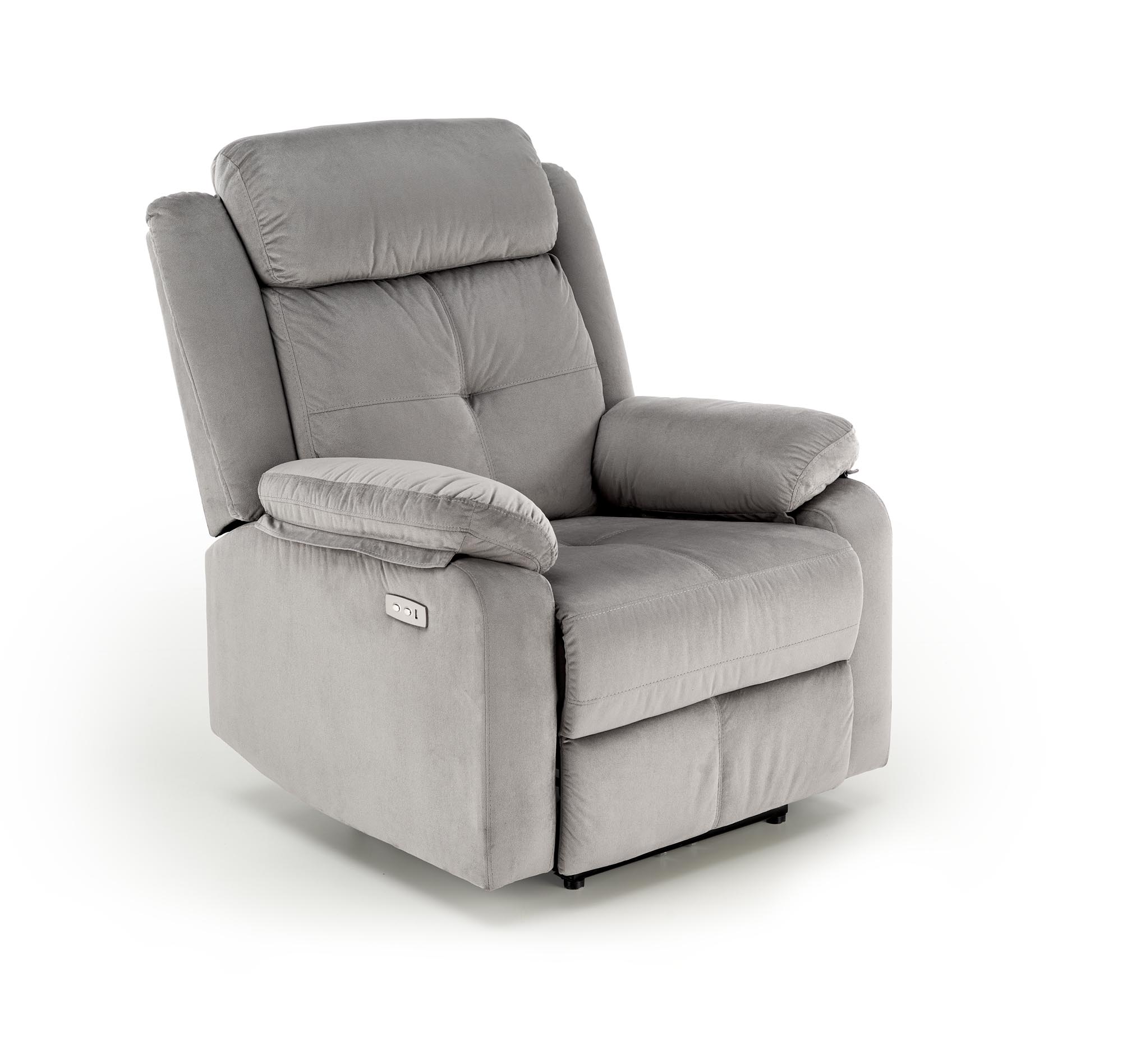 Moderní čalouněné křeslo s pohodlným ergonomicky tvarovaným sedákem a opěrákem čalouněným v kvalitní šedé látce s elektrickým polohovacím mechanismem, které bez námahy nastavíte dle vaší představy a s integrovanou USB zásuvkou. Křeslo Vám nabídne prostor pro pohodlnou relaxaci a odpočinek po náročném dni a zároveň tvoří elegantní bytový doplněk. Je vhodné do obývacího pokoje nebo také pracovny. Křeslo poskytuje oporu tělu, proto v něm vydržíte sedět celé hodiny. Toto stylové křeslo se stylově hodí k pohovkám z naší nabídky.