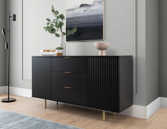 Vneste originalitu s precizním řemeslným zpracováním v podobě moderní široké komody. Elegantní komoda dodá Vašemu interiéru díky svému nadčasovému designu zajímavý vzhled a zaslouženou pozornost. Je k dostání v dekorech Černý mat nebo Kašmír v kombinaci se zlatými nožkami. Tento praktický kus nábytku se hodí díky svému modernímu designu nejen do obývacího pokoje, ale také do pracovny nebo kanceláře. Komoda je vyrobena z kvalitního lamina tloušťky 16 mm s ABS hranou. Tuto elegantní širokou komodu lze zakoupit samostatně a nebo jako součást variabilního systému Nubi.