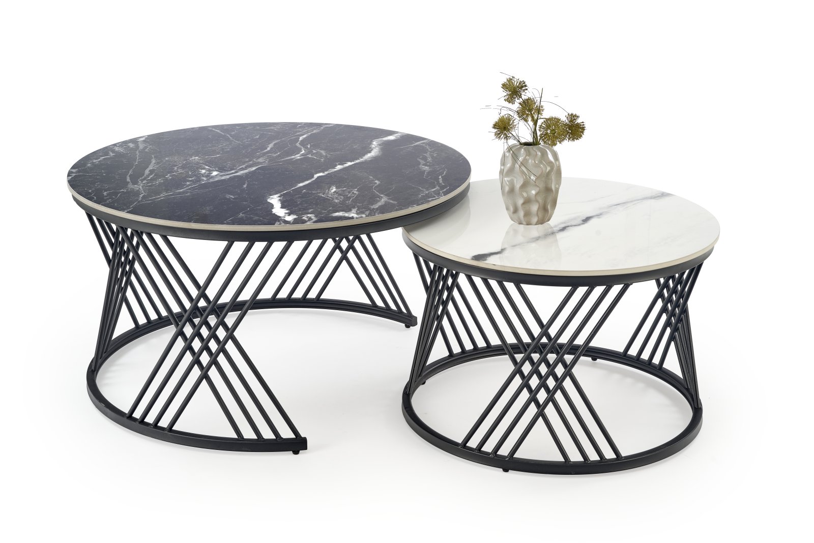Set konferenčních stolků FLAMINGO - je moderní sestava dvou konferenčních stolků nadčasového designu. Stolová deska je v černém a bílém mramorovém dekoru a nohy z chromované oceli v černé barvě.