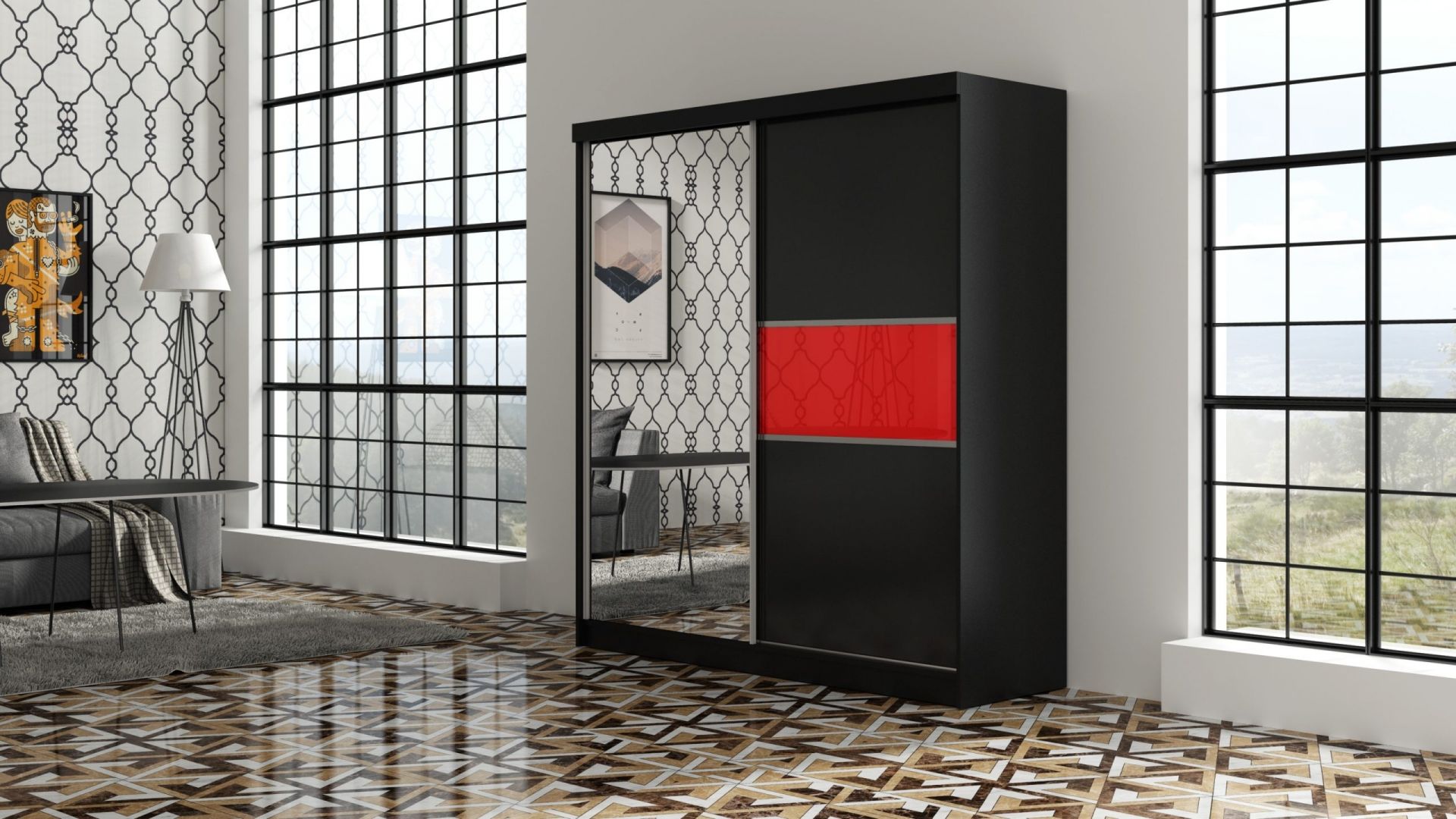 Šatní skříň MADERA nabízí na levé straně zrcadlo, na pravé pak černý + červený lesk.