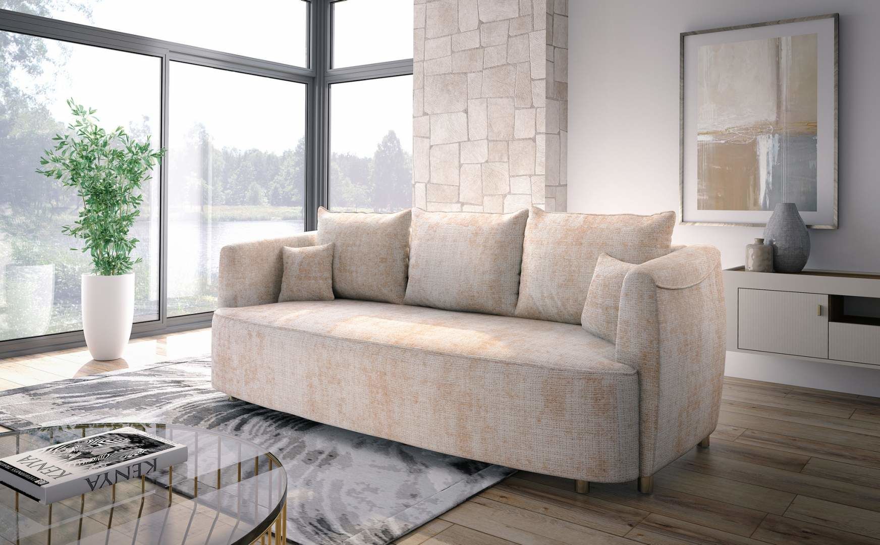 Pohovka RISE je unikátní kus nábytku s nádhernými tvary. Sedák má neobvyklý oválný tvar, který mu dodává lehký a měkký pocit. Jemně zakřivené boky dodávají celému kusu jemnost a eleganci. Aerodynamické linie jsou prolomeny jemným, sladěným čalouněním. Nízké nohy v černé nebo zlaté barvě jsou decentní, elegantní detaily, které zdůrazňují stylový charakter pohovky. Nadýchané polštáře na opěradlo a dekorativní polštáře dodávají celkovému designu nádech jemnosti. Nábytek je vyplněn pružinami Bonnell. Přihrádka na ložní prádlo je vyrobena z bílé laminované desky.