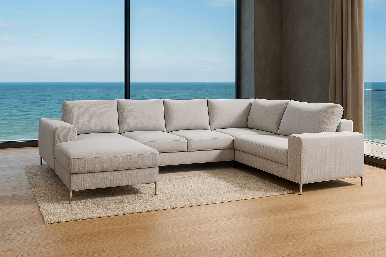 Sedací souprava CHROME do U - pohodlná kvalitní sedací souprava. Sedací souprava má nádech luxusu díky chromové liště a nožkám, které se nachází ve spodní části.