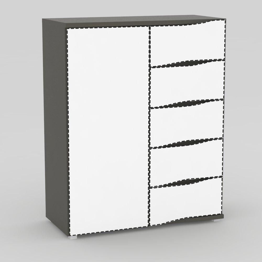 Komoda REA WAVE 7 - je součástí variabilní nábytkové sestavy REA WAVE. Komoda na první pohled zaujme bezúchytkovým provedením dvířek. Na šuplíky je použitý kuličkový plnovýsuv. Pokud budete chtít více barevných čel, jejich počet a barvu uveďte do poznámky.