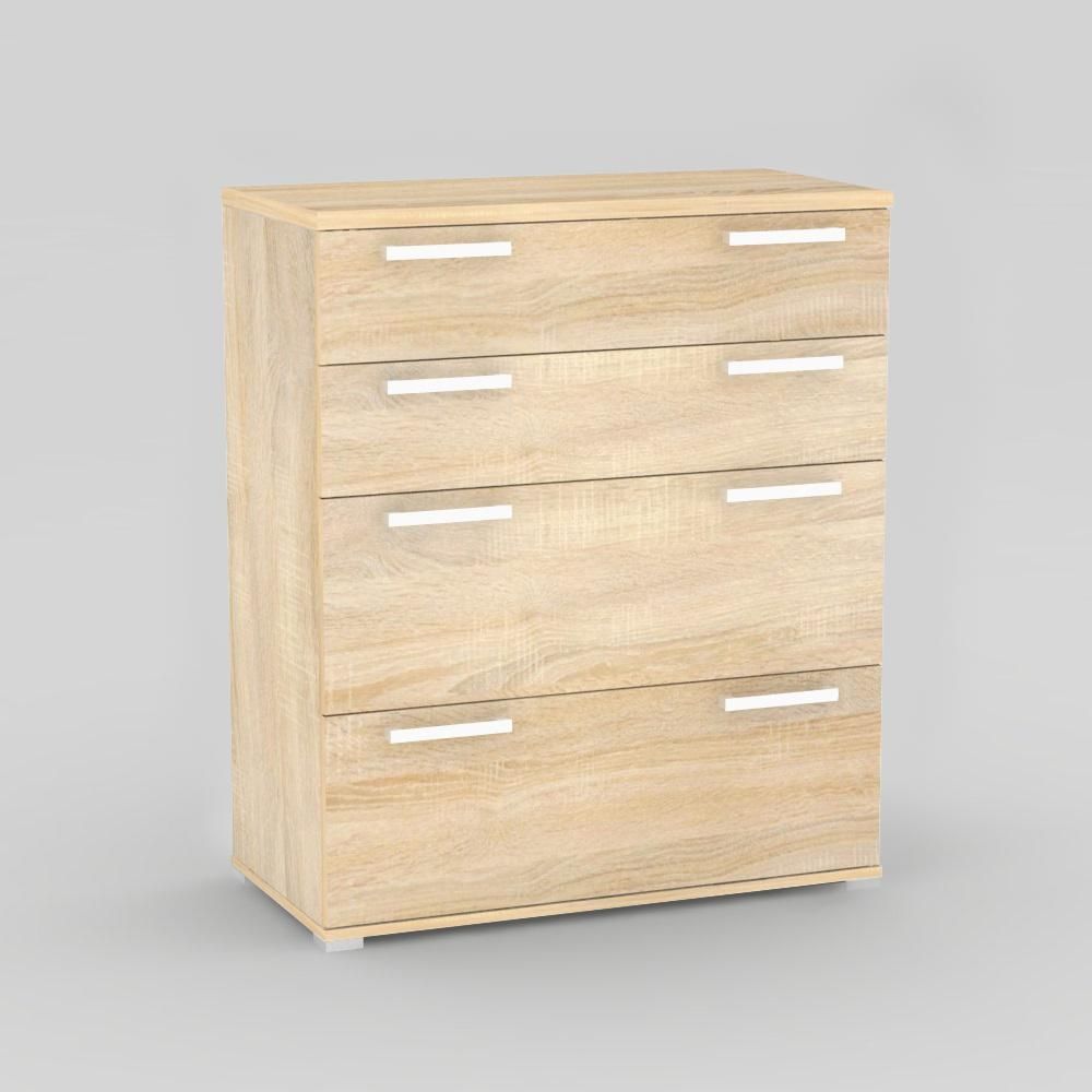 Komody REA OTTAWA UP 2 Vám poslouží jako odkladné místo i jako úložný prostor pro menší předměty. Jsou výborně zpracované a jednoduché. Vyrábí se z praktických středně silných laminovaných dřevotřískových desek tloušťky 16 mm, jež jsou jednak odolné proti vlhkosti i chemikáliím a jednak umožňují značnou úsporu finanční, oproti klasickému masivu. Komody mají navíc i praktické ABS hrany (2 mm), u kterých nehrozí uštípnutí ani jiné mechanické poškození. Elegantní odstíny REA dezénů dřeva dub bardolino, bílá, dub vicenza dává těmto komodám moderní, atraktivní a nevšední design. Vzhled komody doplňují nožičky s kovovým vzhledem, na kterých stojí a vodorovně orientované úchytky ve vrchní části šuplíků. Moderní komoda REA OTTAWA UP 1 sestává ze čtyř zásuvek, přičemž zespodu jsou dvě větší a navrchu dvě menší. Šuplíky se perfektně uplatní jako úložný prostor na oblečení nebo jako odkládací místo pro různé věci. Použité hladké a tiché kování vysune lehce celou zásuvku. Praktická komoda je slovenský nábytek vyráběný společností DREVONA a je určena do každého moderního obývacího pokoje, ložnice nebo předsíně.