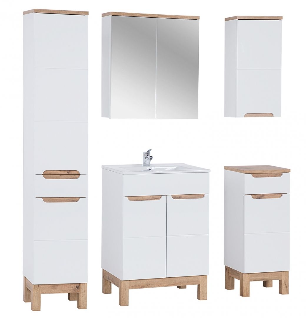 se vyznačuje nejvyšší kvalitou zpracování, v provedení bílý lesk obohacený o dřevěné vložky Dub Wotan. Skříňky mají tichý uzavírací systém.