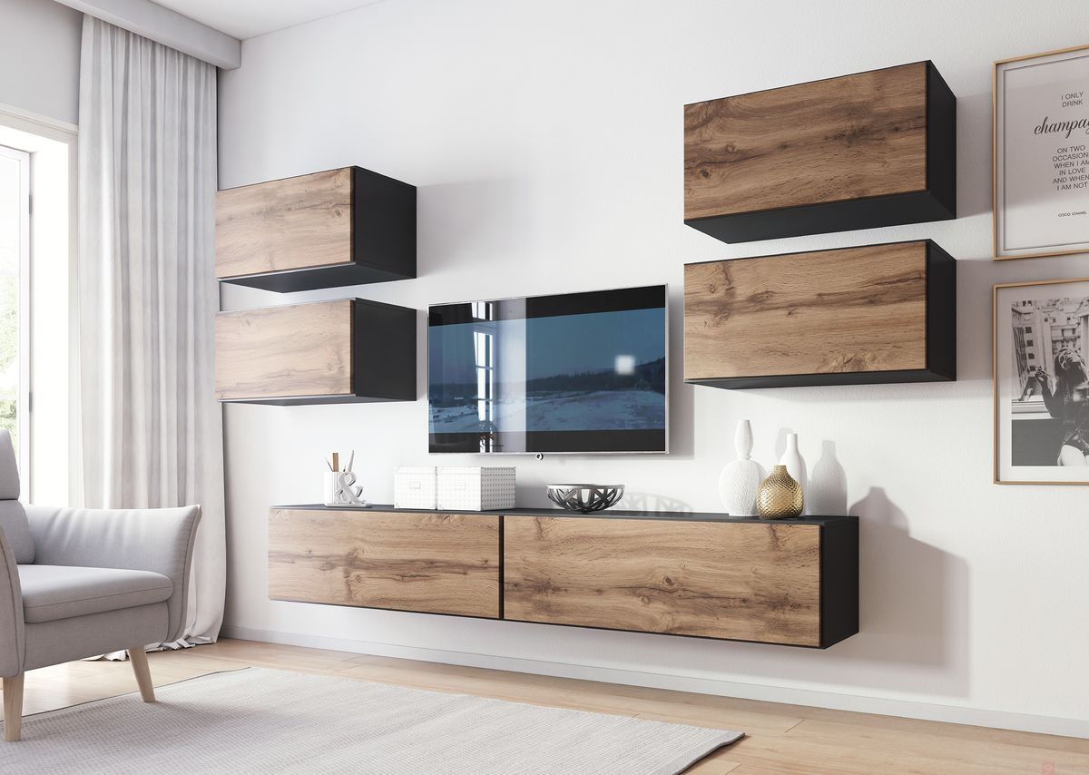 Obývací stěna ROCCO 2 - je moderní sestava do obývacího pokoje vyrobená z lamina v kombinaci dekorůkde se kombinuje hned několik dekorů.