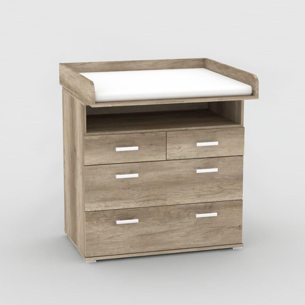 Komoda s přebalovacím pultem je vyrobena z kvalitní laminované dřevotřískové desky tl. 16 mm s ABS hranou 0,5 a 2 mm.
