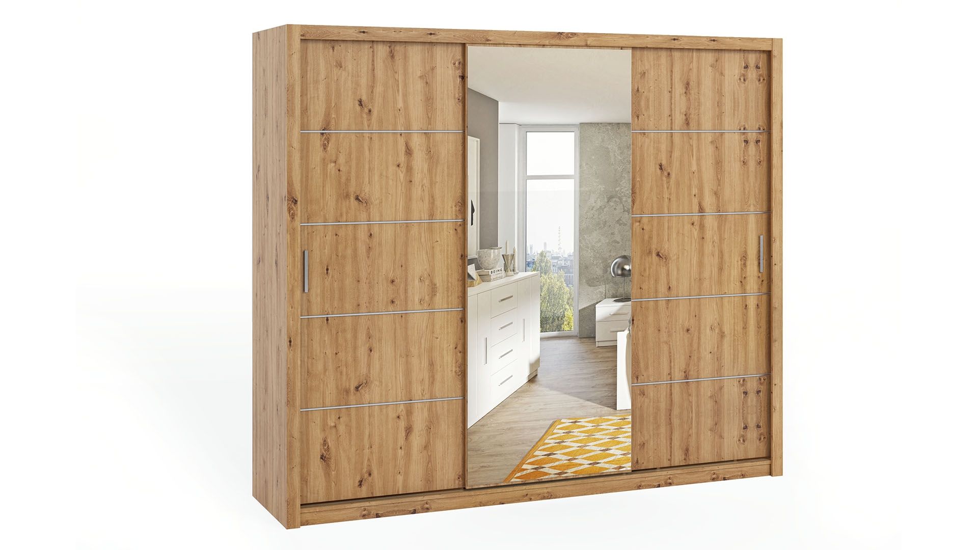 Šatní skříň jsou jednoduše luxusní, originální a elegantní šatní skříně s posuvnými dveřmi s kováním a kvalitní povrchovou úpravou. Své příznivce si najdou především pro svůj moderní a atraktivní design do každého moderního interiéru. Vyrábí se z kvalitního lamina, jež je jednak odolné proti vlhkosti i chemikáliím a jednak umožňuje značnou úsporu finanční, oproti klasickému masivu. Skříně mají navíc i praktické ABS hrany, u kterých nehrozí uštípnutí ani jiné mechanické poškození. Díky své velké váze 232 kg je tato šatní skříň velice stabilní.