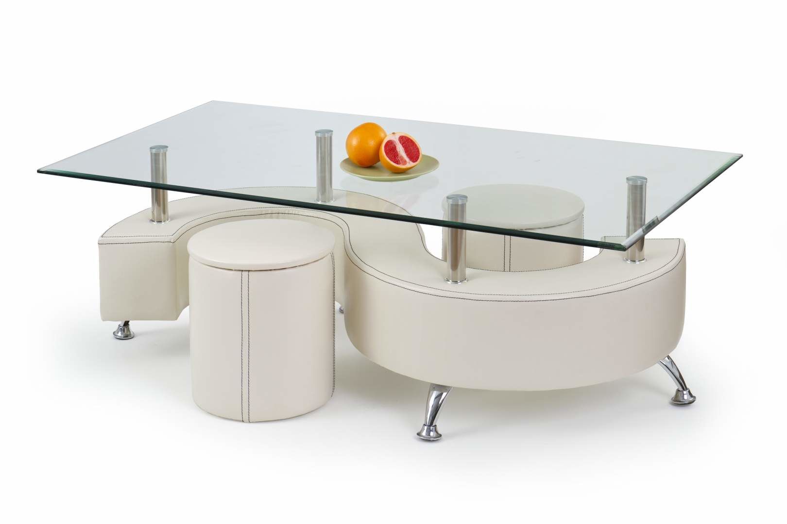Moderní konferenční stolek vhodný do každého interiérů. Díky svému jedinečnému designu dodá Vašemu interiéru styl. Tento konferenční stolek je dostupný s 2 praktickými taburetkami, které lze jednoduše zasunout pod stolek. Horní deska stolku je vyrobena z čirého skla, kovové podpěry desky a nožky stolku jsou z chromované oceli, kostra stolku je z PVC ve dvou barevných provedeních : bílá. Díky praktickým rozměrům je vhodný také do menších prostorů a bytů.