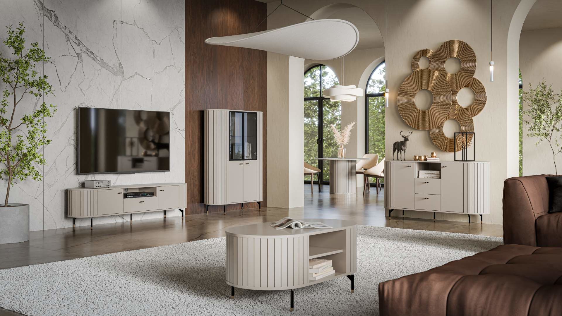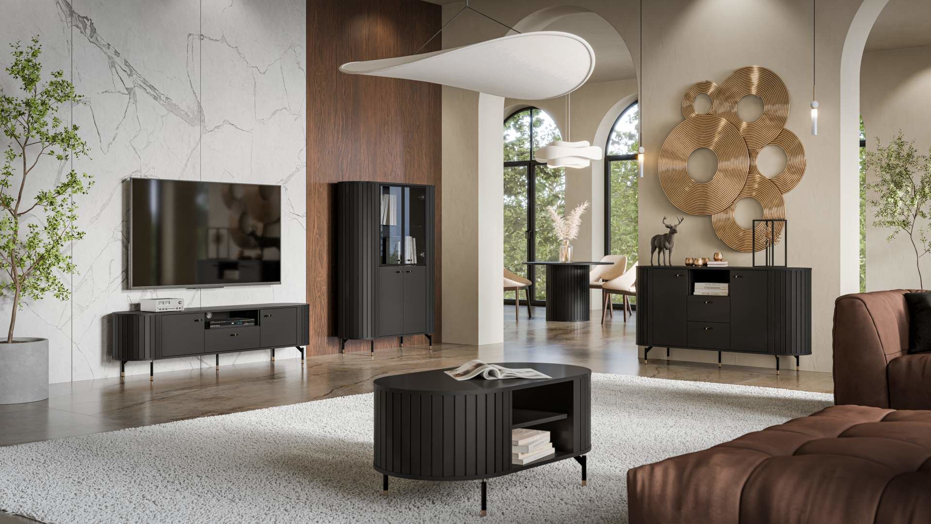 Vyzkoušejte originalitu s precizním řemeslným zpracováním v podobě moderní sestavy do obývacího pokoje ZANTE. Tato stylová sestava s TV komodou, komodou, konferenčním stolkem a vitrínou je díky své prostornosti a množství úložného prostoru praktickým pomocníkem v každém interiéru. Stylová nábytková sestava dodá vašemu interiéru zajímavý vzhled a zaslouženou pozornost. Díky praktické prosklené vitríně, budete mít vše přehledně uspořádané a nejkrásnější dekorace můžete vystavit v prosklené části. Lamino je tloušťky 16 mm. Tato moderní sestava do obývacího pokoje je dostupná ve dvou barevných dekorech a to černý mat a kašmír. Na vitríně a komodách se nacházejí designové detaily, které podtrhují celkový moderní vzhled tohoto moderního nábytku. Právě díky vnitřnímu uspořádání, ale také stylovému barevnému odstínu, je tato nábytková sestava vhodná pro vybavení moderního interiéru. Nábytkovou sestavu ZANTE lze zakoupit dle fotky a nebo jednotlivé díly variabilního nábytkového systému ZANTE samostatně.