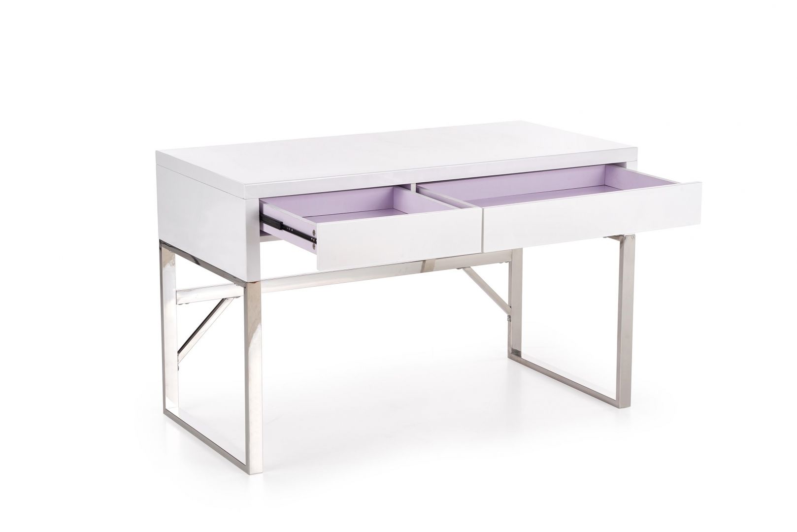 Originální design, netradiční řešení šuplíků, trendy povrchová úprava v bílém lesku a kvalitní použité materiály při výrobě, to vše vám stůl může nabídnout. Materiál mdf desky je všeobecně kvalitnější než lamino. Konstrukce velmi mohutná, z kovu, navíc chráněna chromem. Je vhodný do studentského pokoje, pracovny anebo kanceláře. Díky praktickým rozměrům se stane spolehlivým pomocníkem při práci anebo studiu.