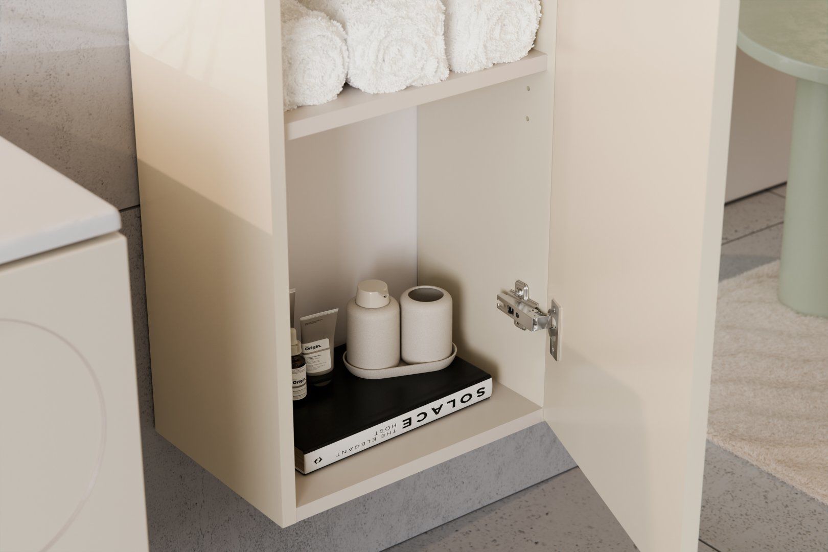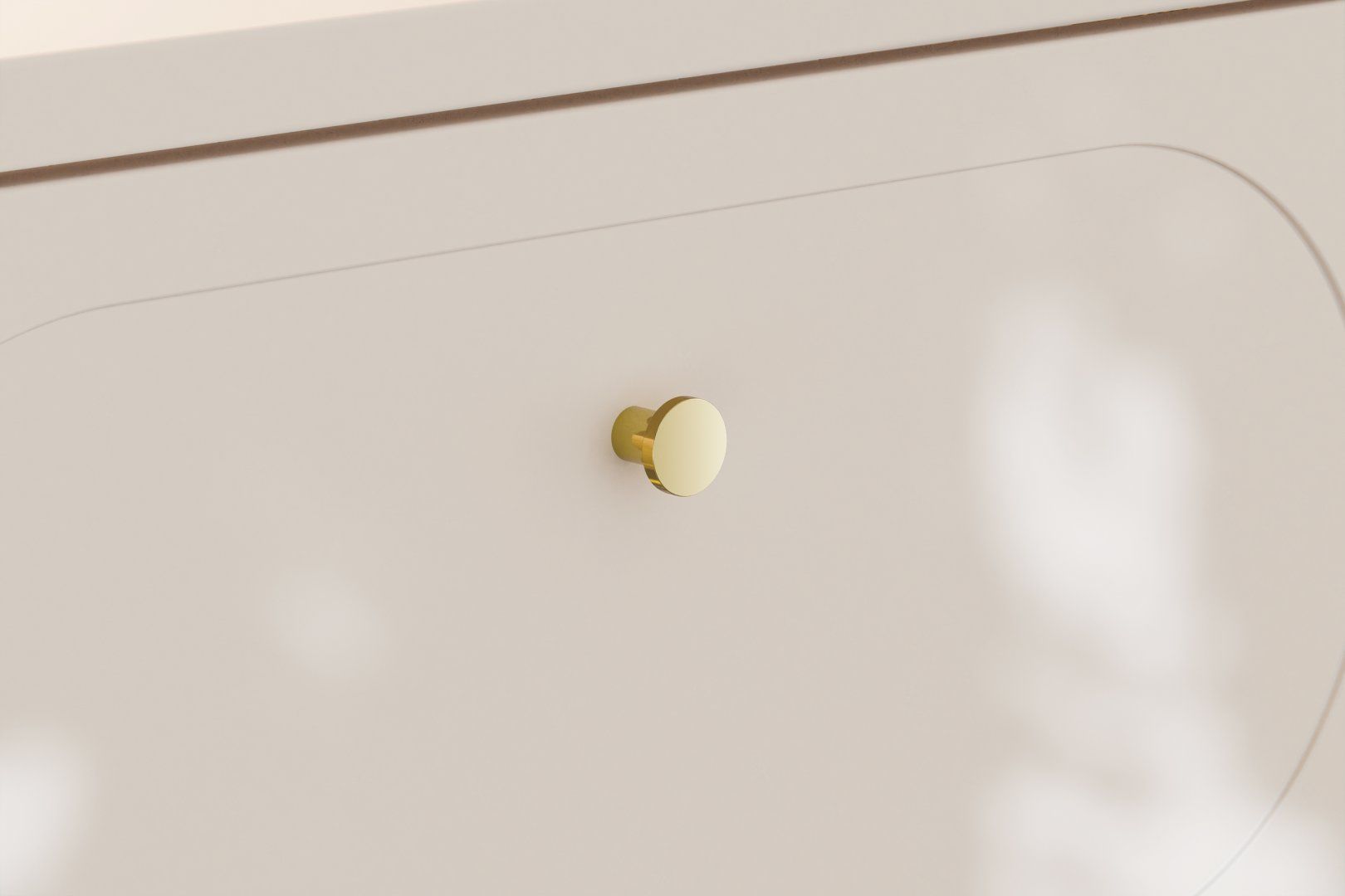 Ve skvělém moderním vzhledu se vyznačuje nejvyšší kvalitou zpracování materiál lamino / MDF v provedení Pískově béžová. Skříňky mají tichý uzavírací systém s kovovými úchyty ve zlaté barvě.