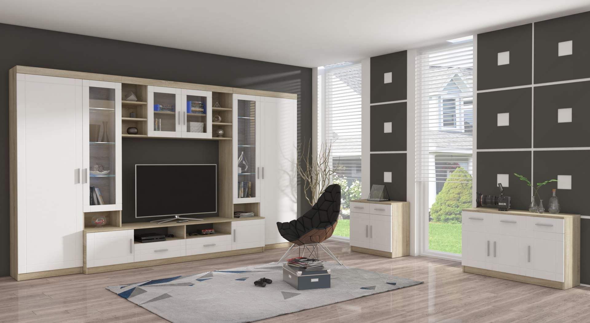 Moderní jednoduchá obývací stěna Vyzkoušejte originalitu s precizním řemeslným zpracováním v podobě moderní nábytkové sestavy do obývacího pokoje. Tato sestava je díky své prostornosti a množství úložného prostoru praktickým pomocníkem v každém interiéru. Stylová nábytková sestava do obývacího pokoje dodá vašemu interiéru zajímavý vzhled a zaslouženou pozornost. Díky praktickému nábytku, budete mít vše přehledně uspořádané. Nábytková sestava je vyrobena z lamina, které věrně imituje reliéf dřeva. Tato moderní nábytková sestava je dostupná v oblíbených barevných dekorech: dub sonoma, dub sonoma / grafit nebo dub sonoma / bílá. Právě díky vnitřnímu uspořádání a stylovému barevnému odstínu, je tato nábytková sestava vhodná pro vybavení moderního interiéru.