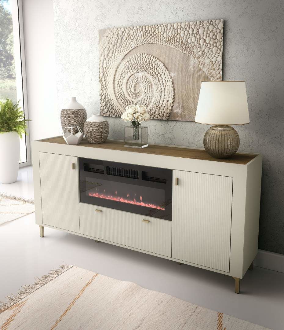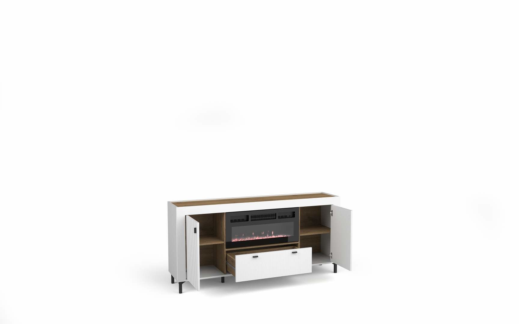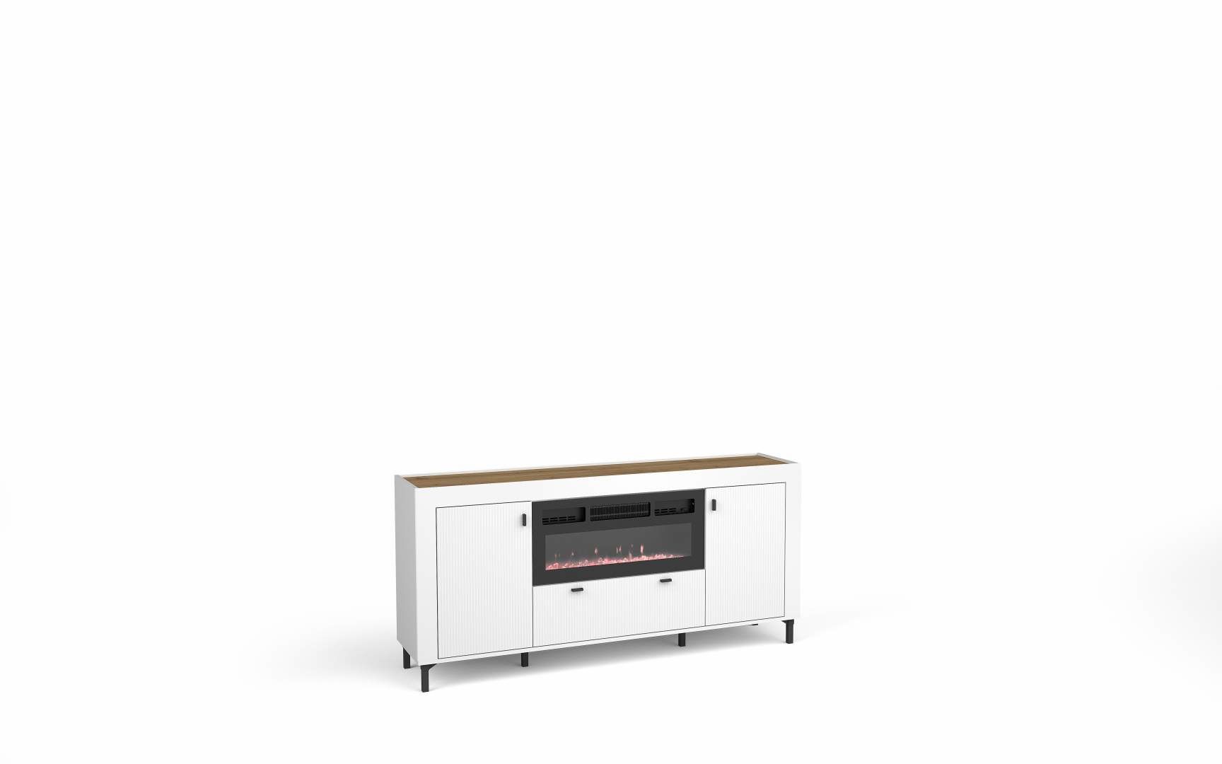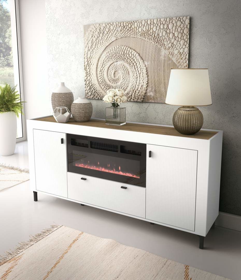 Komoda MOSSA 7 - je moderní komoda vyrobená z kvalitního lamina s ABS hranou v dekorech dub whisky / bílá, dub whisky / černá a dub whisky / kašmír. Za příplatek lze doplnit o stylovou elektrickou krbovou vložku.