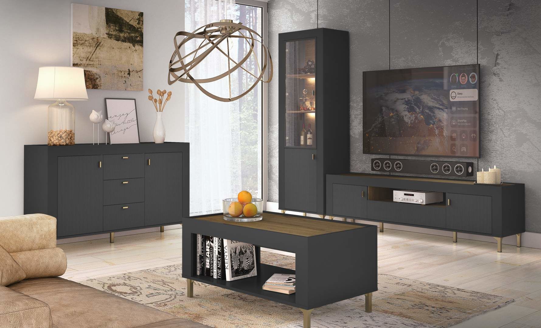 Obývací pokoj MOSSA - je moderní nábytková sestava vyrobená z kvalitního lamina s ABS hranou v dekorech dub whisky / bílá, dub whisky / černá a dub whisky / kašmír.