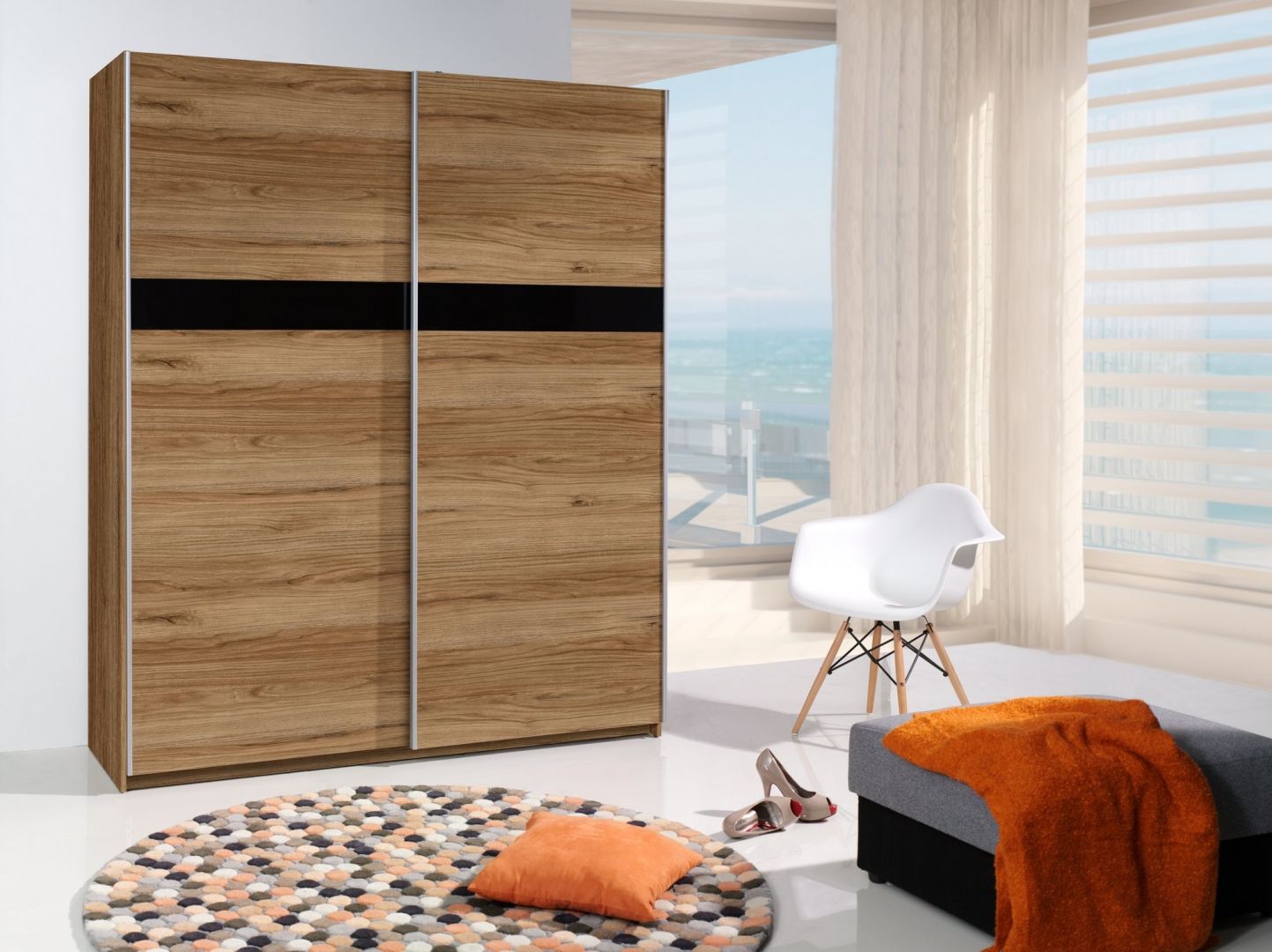 Šatní skříň VARIOR II - je prostorná šatní skříň s posuvnými dveřmi, je vyrobená z lamina tl. 16 mm s ABS hranou v moderní barvě dub catania.