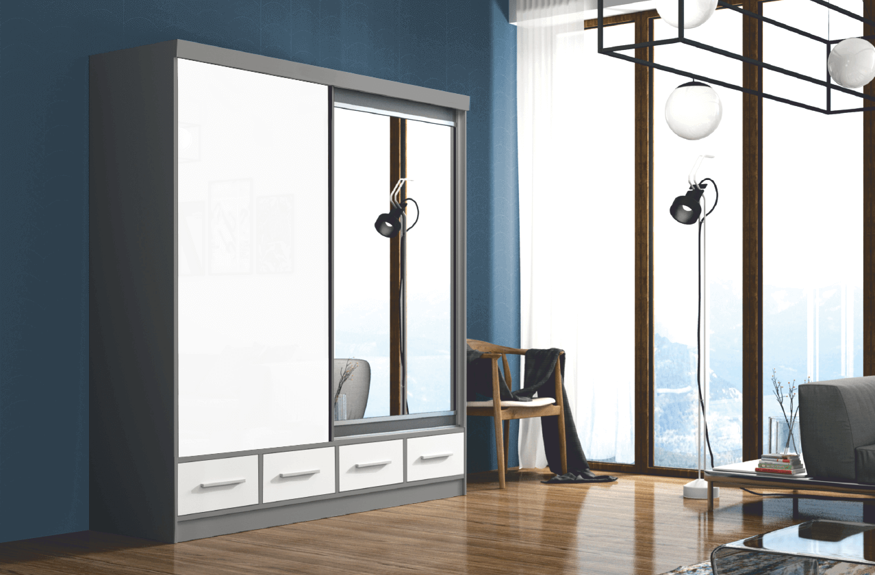 Šatní skříň MILENA 200 se dvěma posuvnými dveřmi a zrcadlem po celé ploše, kde dole skříň nabízí zásuvky na uschování dalších věcí. Jedna část dveří je osazena zrcadlem. Vnitřní uspořádání této šatní skříně kde na levé polovině se nachází šatní prostor s tyčí na ramínka a na pravé polovině jsou čtyři prostorné police. Šatní skříň má ideální vnitřní uspořádání. Skříň je vyrobena z kvalitních 16 mm silných lamino desek s hranami s ABS páskami, které jsou odolné proti oděru.