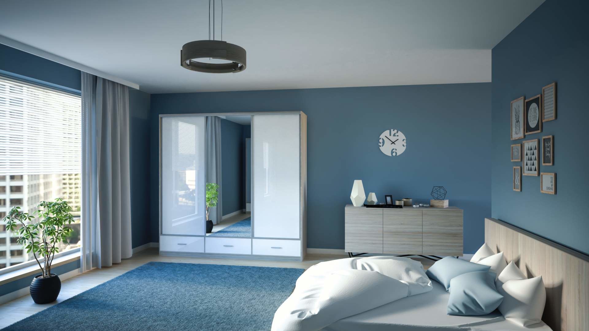 Šatní skříň LOPEZ 250 se třemi posuvnými dvířky a zrcadlem po celé ploše, kde dole skříň nabízí zásuvky na uschování dalších věcí. Jedna část dveří je osazena zrcadlem.Vnitřní uspořádání této šatní skříně kde na pravé polovině se nachází šatní prostor s tyčí na ramínka a na levé polovině jsou čtyři prostorné police. Šatní skříň má ideální vnitřní uspořádání. Skříň je vyrobena z kvalitních 16 mm silných lamino desek s hranami s ABS páskami, které jsou odolné proti oděru. Šatní skříň je vyráběna v moderních dekorech bílé doplněná o bílý lesk.