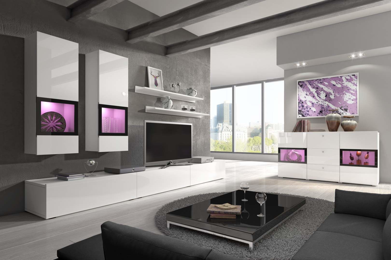 Obývací sestava BAROS - je moderní sestava do obývacího pokoje vyrobena z kvalitního lamina s ABS hranou v dekoru Bílá/ bílý lesk - černé rámy. Za příplatek lze obývací sestavu vybavit úsporným LED RGB osvětlením.