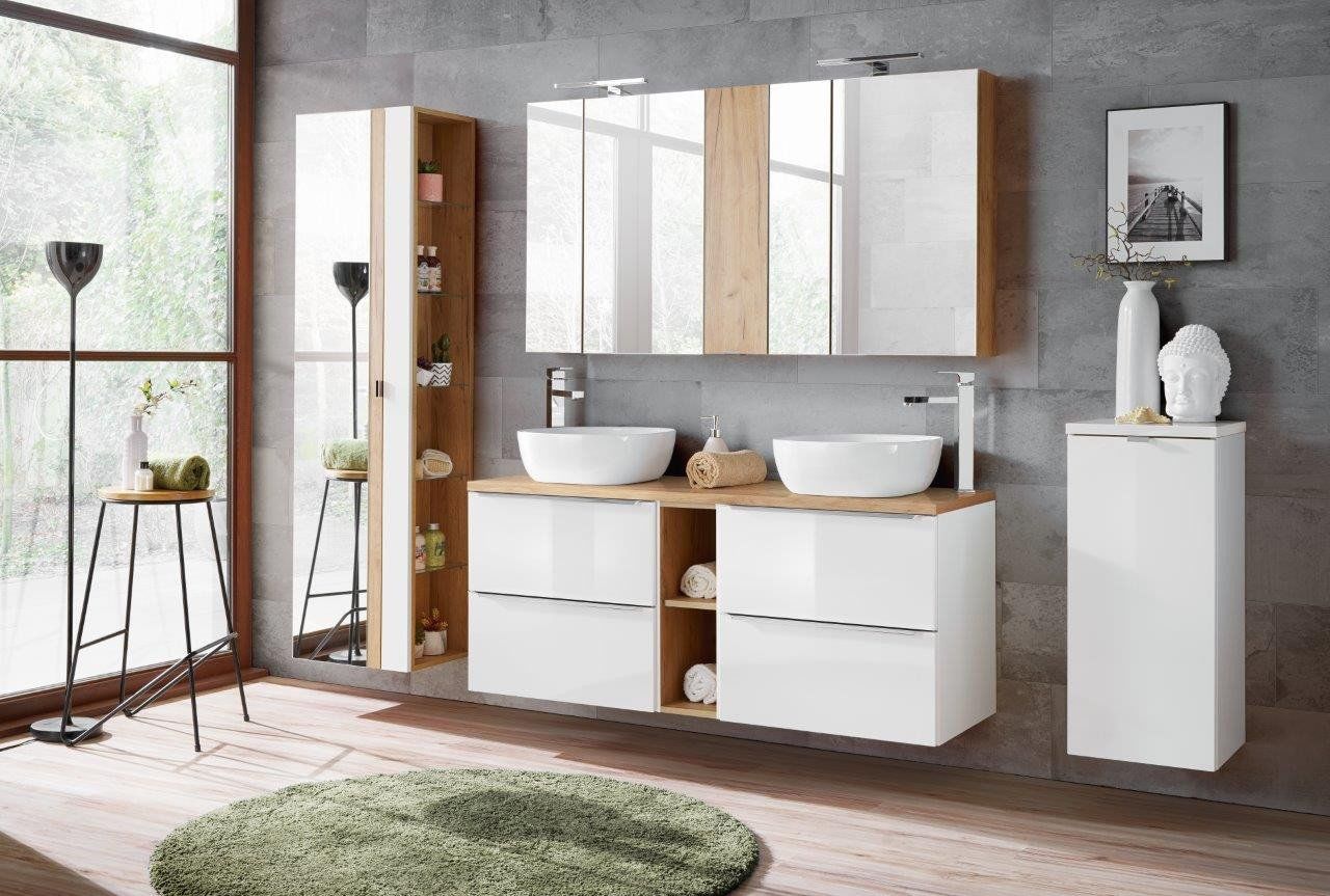 Sestava KAPRI je klasickou nabídkou pro všechny koupelny. Nábytek má tichý uzavírací systém. Barevné provedení korpus - Bílý lesk, dvířka - Bílý lesk, vnitřní dekor - Dub Craft zlatý