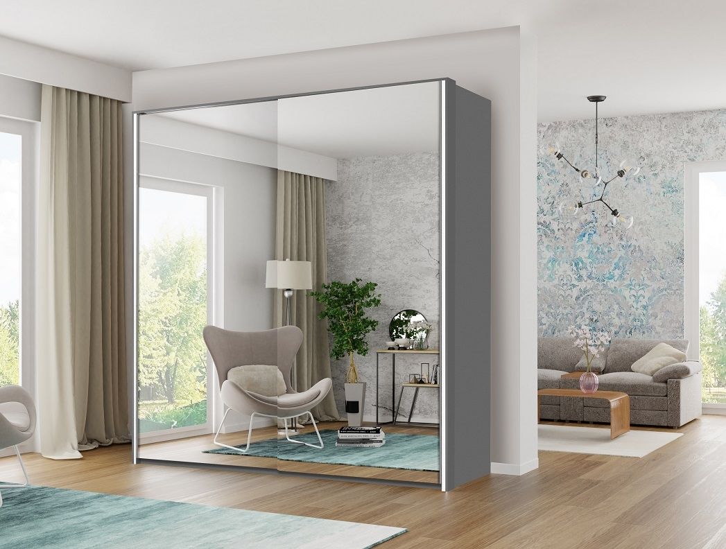 Šatní skříň BREGO - je vyrobená z lamina a zrcadlovými posuvnými dveřmi s kováním sevroll a tichým dojezdem. LED osvětlení je ve standardním vybavení skříně.