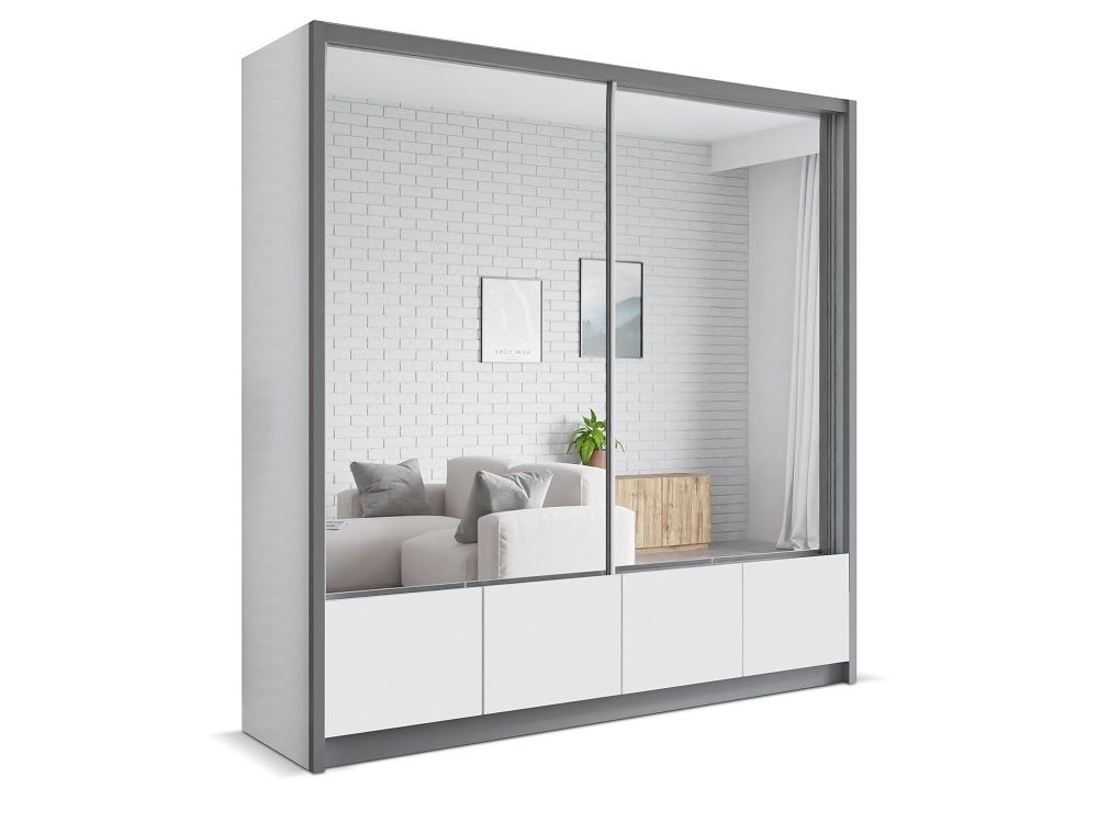 Šatní skříň LUISS 200 - je vyrobená z lamina a zrcadlovými posuvnými dveřmi s kováním sevroll a tichým dojezdem. Nabízíme v bílém nebo šedém barevném provedení.