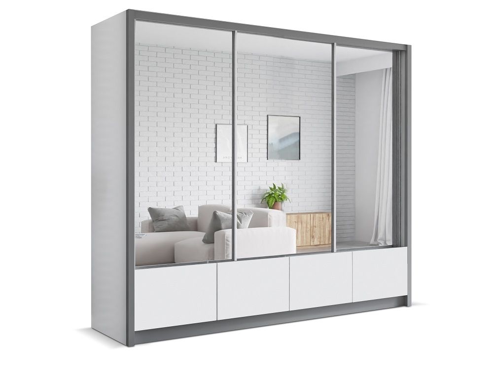 Šatní skříň LUISS 250 - je vyrobená z lamina a zrcadlovými posuvnými dveřmi s kováním sevroll a tichým dojezdem. Nabízíme v bílém nebo šedém barevném provedení.