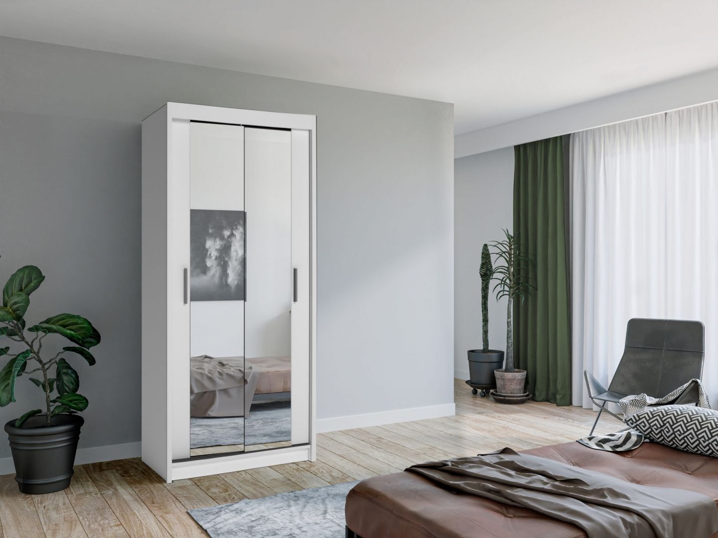 Šatní skříň CHANTY MINI - je skříň do menších prostor s posuvnými dveřmi, je vyrobená z lamina v pěti oblíbených barevných dekorech v kombinací se zrcadlem.
