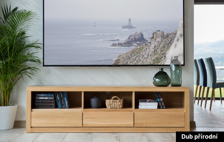 Televizní stolek z masivu je určen pro milovníky přírodních materiálů, především kvůli svému jednoduchému elegantnímu designu. Vyrábí se z kvalitního precizně zpracovaného masivu dubu. Barvu masivního dubu je přírodní nebo několika krásných barevných odstínech. Televizní stolek má zaoblené hrany a tvoří dokonalý dojem s nábytkem vyrobeným z masivního dubu.