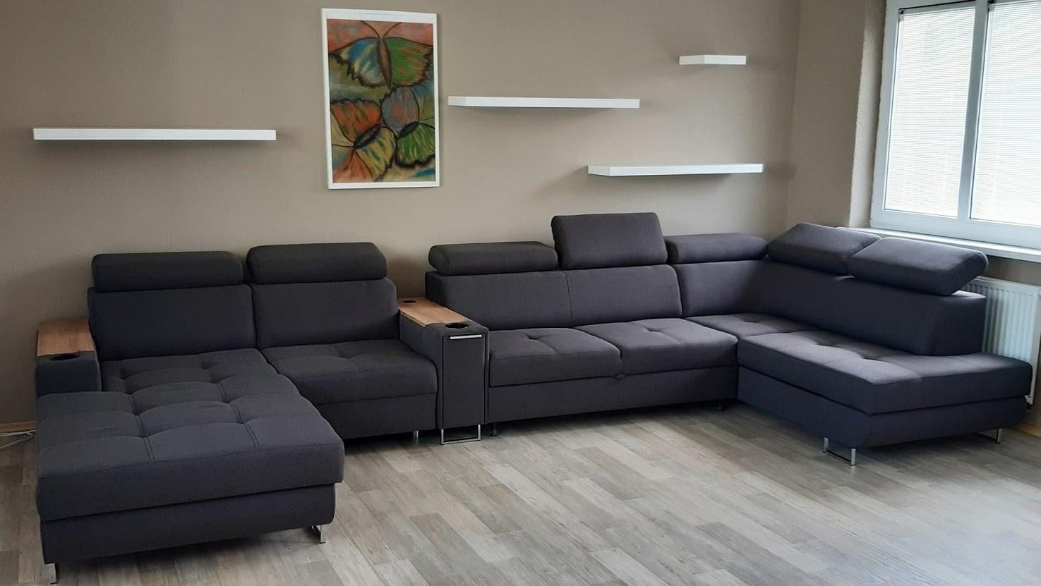 Rozkládací sedací souprava SEVIL DUO do U je elegantní a tvarově zajímavý nábytek, který zaujme svým vzhledem. Má krásné provedení a přináší nový lesk moderního designu pro váš interiér. Majitelé těchto sedaček u nich ocení zejména jejich výbornou povrchovou úpravu a maximální pohodlí díky masivním bokům a širokému sedu. Výplň sedáku tvoří vysoce kvalitní PUR pěna položená na pružinách Falista, tím je zajištěna vysoká životnost sedací soupravy. Konstrukce sedačky je vyrobena v kombinaci dřevotřísky a masivního dřeva a je ideální pro obývací pokoj jako domácí centrum pro odpočinek a relaxaci. Náleží k ní velký výběr potahových materiálů včetně omyvatelných. Vybraný potahový materiál uveďte při objednávce do poznámky, popřípadě nás kontaktujte. Vzorník pro výběr potahu sedaček je k dispozici i na prodejně. Rohovka je rozkládací na velikost spacího lůžka 126 x 200 cm. Je polohovatelná, má úložný prostor, který je vhodný na uschování peřin či dek a nebo jiných předmětů. Součástí sedací soupravy je i multifunkční područka s vestavěnou barovou skříňkou, kterou lze vysunout. Nápoje si můžete bezpečně odložit do držáků v područce a díky výsuvné zásuvce lze područku využít jako dobíjecí stanici na mobil nebo notebook.