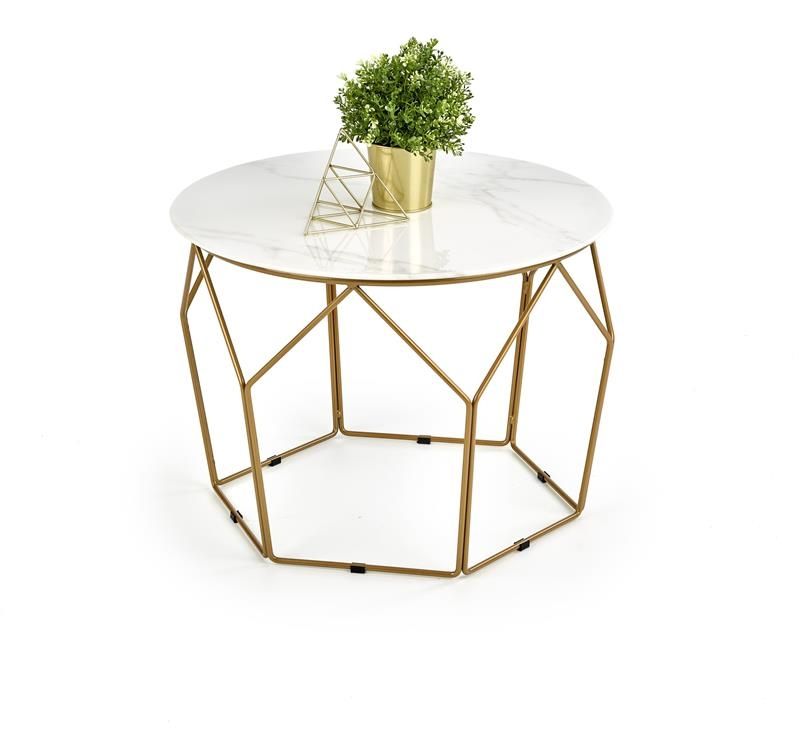 Konferenční stolek nadčasového designu. Vrchní deska konferenčního ze skla v barvě bílého mramoru. Stolek je vyroben v kombinaci skleněné desky v barvě bílého mramoru a noh z chromované oceli ve zlaté barvě. Tento moderní konferenční stolek je vhodný do stylových interiérů, obývacích pokojů nebo pracoven.