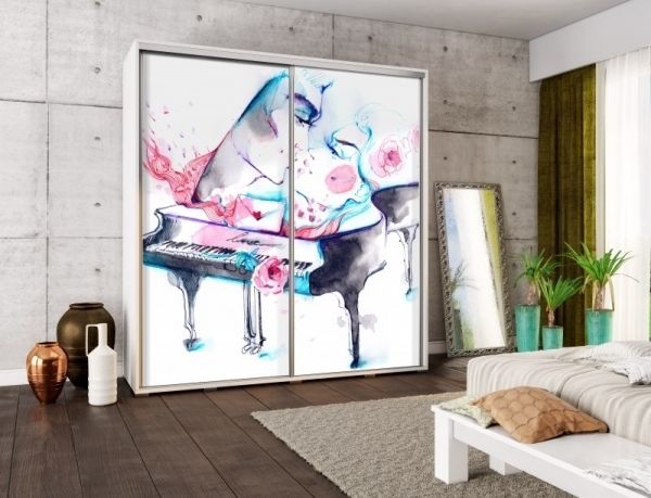 Šatní skříň PEM 205 Fortepian 2 je vyrobena z lamina tl. 22 mm s ABS hranou a posuvnými dveřmi s kováním SEVROLL. Barevné dekory bílý, dub sonoma, švestka wallis a kaštan wenge.