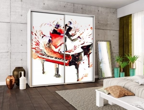 Šatní skříň PEM 205 Fortepian je vyrobena z lamina tl. 22 mm s ABS hranou a posuvnými dveřmi s kováním SEVROLL. Barevné dekory bílý, dub sonoma, švestka wallis a kaštan wenge.